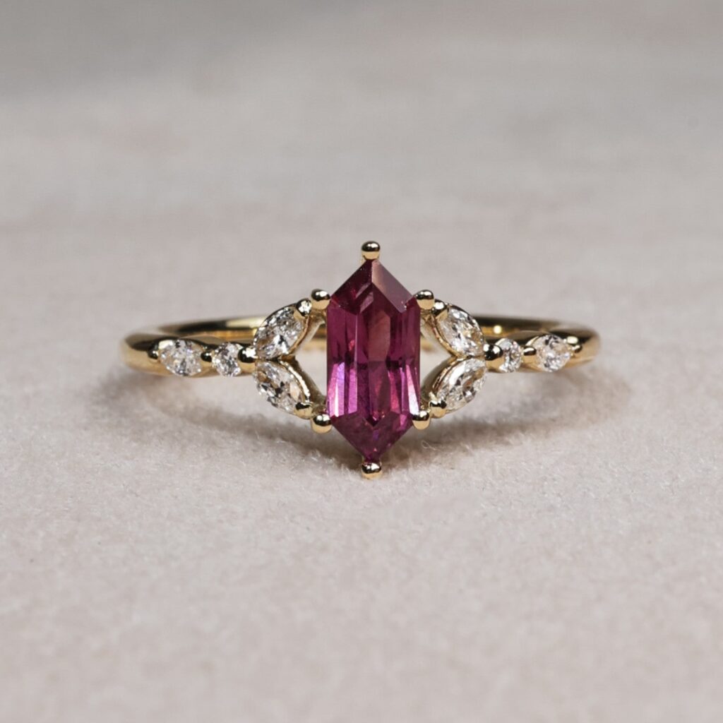 This stunning art deco inspired piece is anchored by an elongated hexagon umbalite garnet, which is flanked by a collection of round and marquise lab grown diamonds, all set in 18ct yellow gold.
