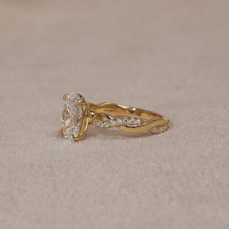 This piece features a stunning oval lab grown diamond, accented by a diamond set band with multiple twists set in 18ct yellow gold.