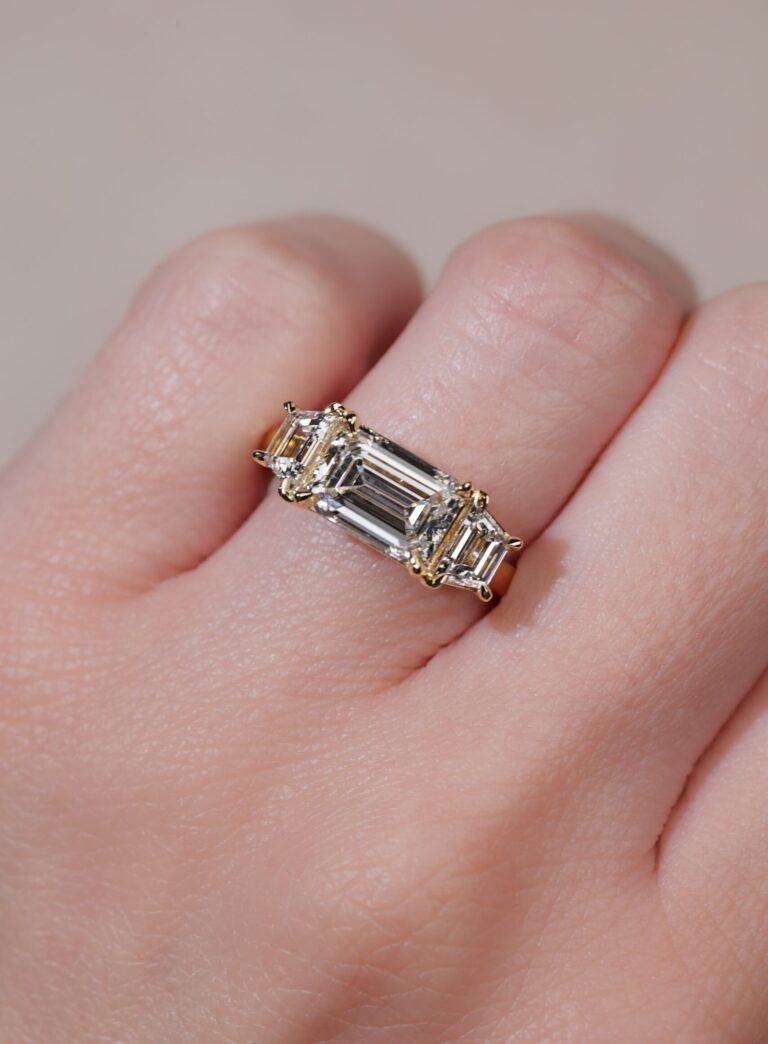 Three stone engagement rings can be set in various ways, but ultimately, it’s up to you and what designs you like. It’s important to consider your lifestyle to ensure that the design you pick is going to be durable enough for daily wear. Claws allow extra light in under the setting, so the resulting stones appear brighter, but they do require more maintenance long term. Bezel or half bezel settings protect the stones more and require less maintenance, but they’ll reduce the amount of light coming into the stones underneath. With a custom three stone engagment ring, you can also add details like milgraining or engraving to give the settings a more vintage feel.